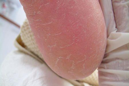 Pacjent z cukrzycą. Z powodu choroby skóra stóp jest bardzo przesuszona czego następstwem są pękające pięty.