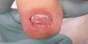 Paznokieć po urazie mechanicznym. Na zdjęciu widoczna skrzepnięta krew. Paznokieć oczyszczono i zrekonstruowano przy pomocy masy akrylowej.